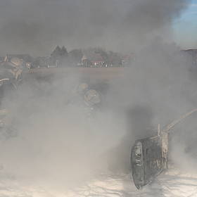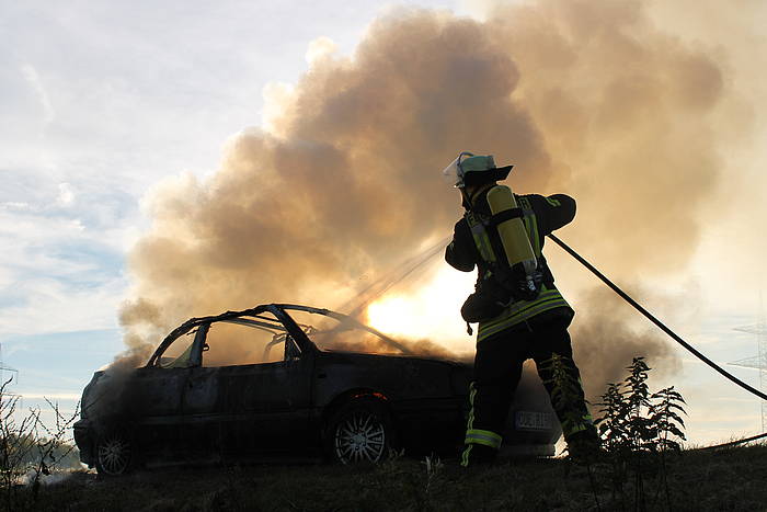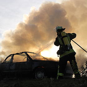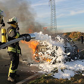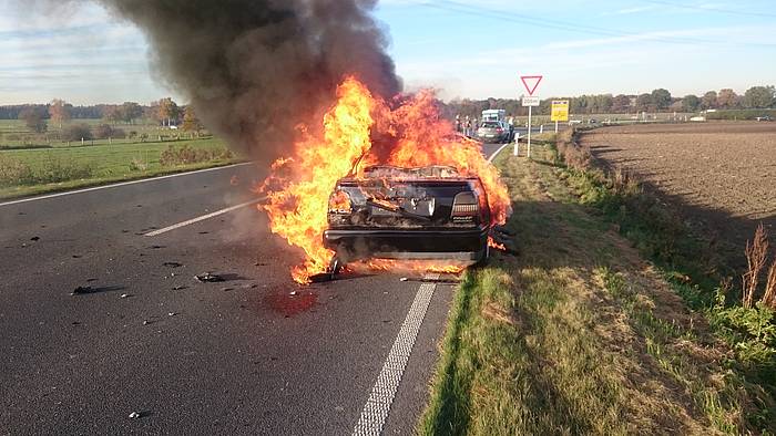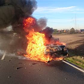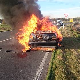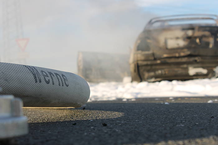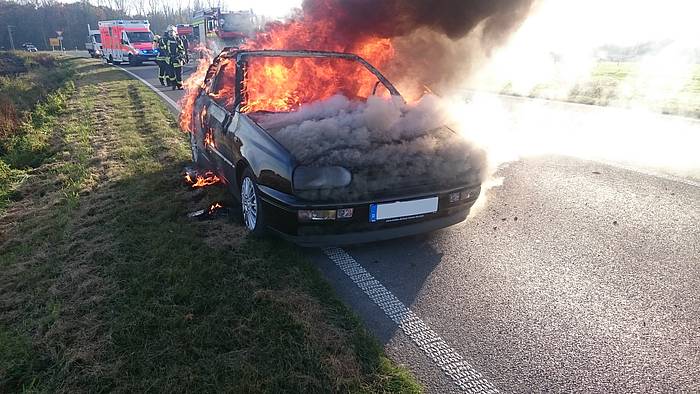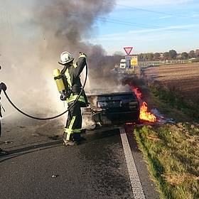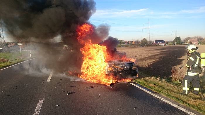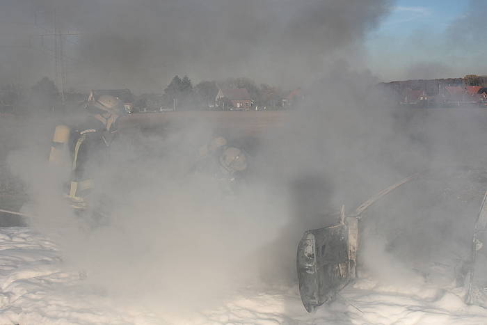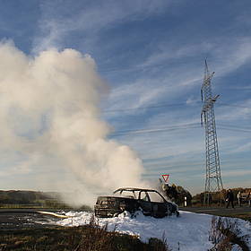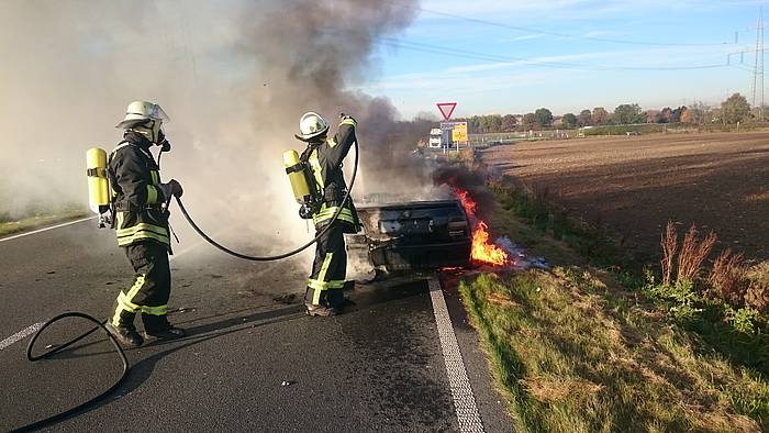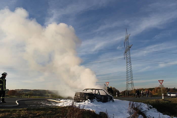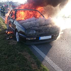 Schon auf der Anfahrt war die Rauchsäule des in Vollbrand stehenden PKW von weitem sichtbar. Trotz des schnell eingesetzten Löschangriffs durch das zuerst eintreffenden Löschfahrzeug, konnte das komplette ausbrennen des Fahrzeuges nicht verhindert werden. Der Tank des Fahrzeugs war durch den Brand bereits beschädigt, so dass sich immer wieder Benzin entzündete.