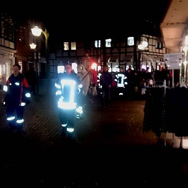 Zwei Jugendfeuerwehr-Leute führten den Zug mit ihren Fackeln an. Zwischen Pferd und Umzugsteilnehmern wurden zwei Kameradinnen positioniert, um die Kinder während des Umzugs ein wenig auf Distanz zu halten. Zwei weitere Kameraden schlossen den Zug, wiederum mit ihren Pechfackeln.