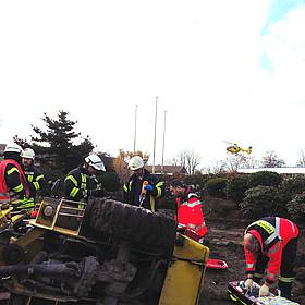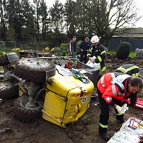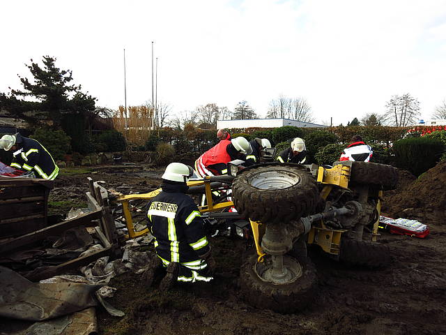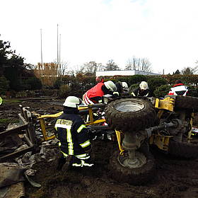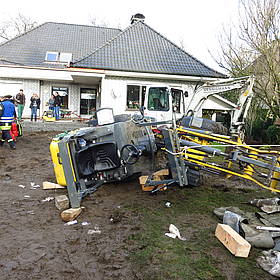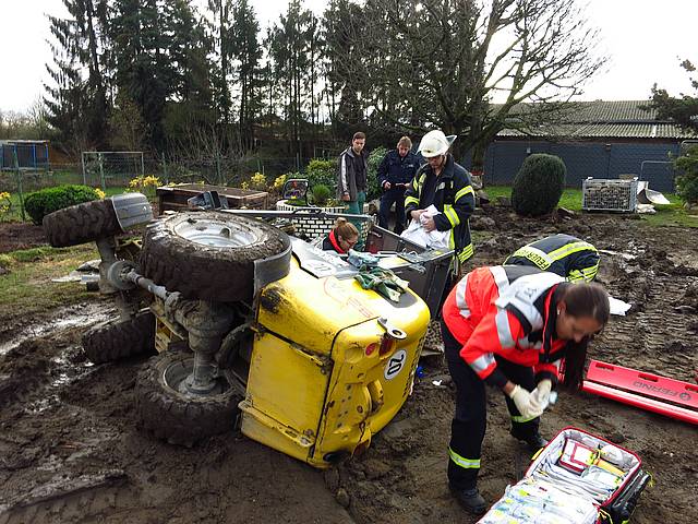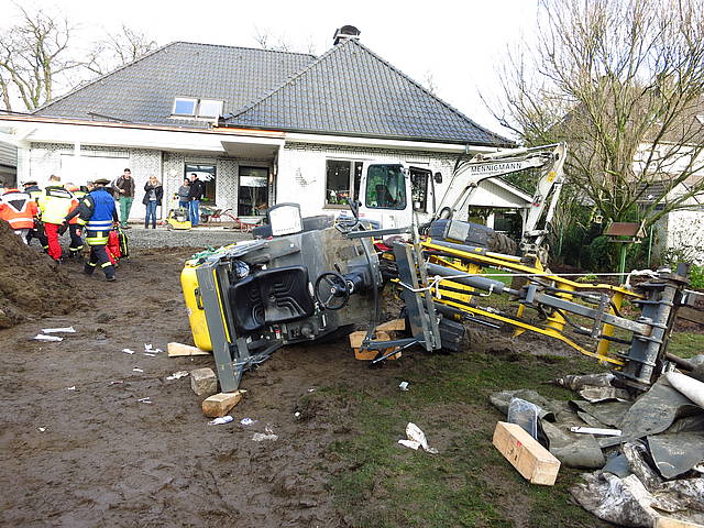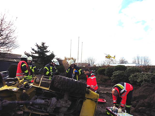 Um 11:33 Uhr wurde der Löschzug 1 der Freiwilligen Feuerwehr Werne mit dem Einsatzstichwort „Person klemmt“ zu einem Unfall mit einer eingeschlossenen Person an der Lippestraße alarmiert. Bei Gartenbauarbeiten war ein Arbeiter auf einem Privatgrundstück mit seinem Gelenkbagger umgestürzt und hatte sich dabei schwer am Rückgrat verletzt. Der Mann konnte sich weder selbstständig noch mit Hilfe des Rettungsdienstes befreien, weshalb die Feuerwehr zunächst das Dach des Minibaggers demontieren musste. Erst danach wurde der Patient stabilisiert und schonend aus dem Führerhaus befreit.