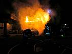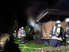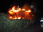 Eine erste Erkundung ergab, dass der Dachstuhl eines ausgedehnten Bungalows bereits im Vollbrandstand und Teile des Gebäudes verraucht waren. Die Bewohner öffneten nach kurzer Zeit auf das Klopfen und Klingel der Feuerwehr. Sie hatten den Brand nicht bemerkt. Zu diesem Zeitpunkt befanden sich fünf Personen, darunter ein Kind, im Gebäude. Diese konnten sicher aus dem noch nicht betroffenen Gebäudeteil heraus geführt werden. Eine Befragung ergab, dass sich in dem brennenden Gebäudebereich niemand mehr aufhalten sollte. Diese Information wurde mit Hilfe eines Angriffstrupps unter Atemschutz kontrolliert und bestätigt.