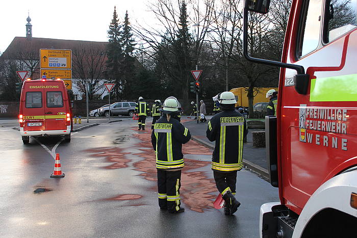Am Nelkendienstag wurden um 16:35 Uhr die freiwilligen Einsatzkräfte der Feuerwehr Werne zu einer Ölspur im Bereich der Wienbrede / Stockumer Straße / Lippestraße / Bült gerufen. Die betroffenen Bereiche wurden für die Säuberungsmaßnahmen kurzfristig für den Verkehr gesperrt. Die Ölspur wurde mit Ölbindemittel abgestreut, das anschließend wieder aufgenommen wurde.