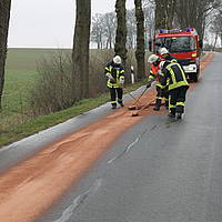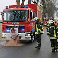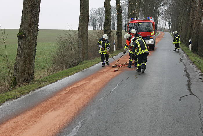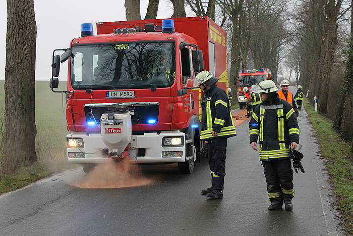 Etwas länger beschäftigten die Einsatzkräfte der Löschgruppe Holthausen und des Löschzugs Mitte am Samstag (05.03.2016) eine lange Ölspur auf der Wesseler Straße. Vermutlich war Diesel aus einem Fahrzeugtank ausgelaufen, was die Straße auf mehr als 2 km verunreinigte. Um 12:49 Uhr wurden die Einheiten alarmiert. Mit Hilfe des sogenannten Öltigers, einer Streueinrichtung auf dem GW-Logistik wurde die Ölspur abgestreut. Dazu wurden 45 Sack Ölbindemittel benötigt. Ein Spezialunternehmen musste die Straße danach reinigen. Nach mehr als zwei Stunden rückten die rund 20 Einsatzkräfte mit ihren fünf Fahrzeugen wieder ein.