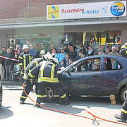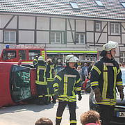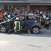 In der Schauübung ab 14:00 Uhr wurde den vielen Zuschauern eine Rettung aus einer komplexen Unfallsituation präsentiert. Drei Fahrzeuge waren mit insgesamt sechs Insassen in einen Unfall verwickelt, drei Personen mussten betreut und drei Personen aus zwei Fahrzeugen mit hydraulischem Rettungsgerät befreit werden. Hierzu wurde die Jugendfeuerwehr und Personen aus dem Publikum in die Übung als Verletztendarsteller einbezogen.