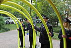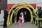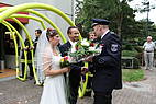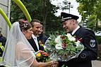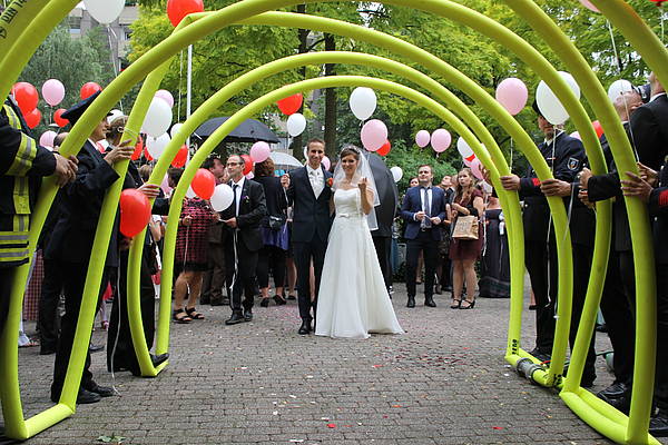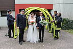 Traditionell wurden die "Hochzeits"-Bögen aus B-Schlauch - gefüllt mit Luft - aufgebaut und angekommen am Ende der Bögen von der Löschzugführung mit Blumenstrauß gratuliert.