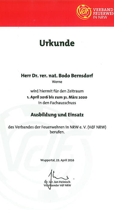 Aus dem Löschzug 1 der Freiwilligen Feuerwehr Werne wurde Dr. Bodo Bernsdorf für den Ausschuss "Ausbildung und Einsatz" benannt. Der Fachausschuss berät über grundlegende Aspekte der Feuerwehrausbildung und des Einsatzablaufs und gibt Empfehlungen, die über mehrere Stufen in die Feuerwehrausbildung Einzug halten. Dabei tagt er gemeinsam und in enger Abstimmung mit dem entsprechenden Ausschuss der Arbeitsgemeinschaft der Leiter der Berufsfeuerwehren (AGBF) in Nordrhein-Westfalen. In diesen Ausschüssen entstehen Empfehlungen für die gesamte Ausbildung von der Grundausbildung auf Standortebene bis hin zu der Führungskräfteausbildung der Feuerwehrschulen - in NRW beispielsweise dem Institut der Feuerwehr Nordrhein-Westfalen (IdF NRW).