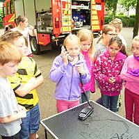 Dann wurde es im Praxisteil spannend: Die Kinder konnten auf dem Schulhof mit Hilfe einer mitgebrachten Telefonanlage live einen Notruf absetzen. Verschiedene Szenarien wurden angenommen, die einige Kinder dem Disponenten beibringen mussten, damit dieser die korrekten Rettungskräfte alarmieren konnte. Ein Brand im Kinderzimmer, ein Unfall mit dem Fahrrad, die Oma an der Dachrinne hängend – egal welche Herausforderung gefragt war: Die Kinder meisterten die Notrufe mit Bravour.
