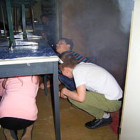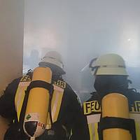 Schließlich wurde es ernst. Es brannte im Werkraum! Mit Hilfe einer Diskonebel-Maschine wurde ein Brand mit heftiger Rauchgasentwicklung simuliert. Die Kinder erfassten schnell, dass es am Boden immer noch am sichersten ist und gingen in die Hocke. In Form eines Trupps unter Atemschutz nahte die Rettung durch die Feuerwehr. Durch die Atemschutzmasken waren die Anweisungen der Feuerwehrfrau und des Feuerwehrmannes etwas gedämpft. Aber sie trugen eindeutig zur „Rettung“ bei. Und jetzt kam die eigentliche Herausforderung für die Kinder! Ganz schnell musste festgestellt werden, ob alle Kinder den Werkraum verlassen konnten. Denn jede Minute länger im Brandraum kann im Ernstfall zu erheblichen Verletzungen oder gar zum Tod eines Kindes führen! Daher war es wichtig, dass sich die Kinder unmittelbar in Zweierreihen aufstellten und die Lehrer ermitteln konnten, ob ein Kind fehlt. Und tatsächlich: Bei beiden Übungen mussten die Feuerwehrleute nochmal in den Brandraum, um auch das letzte Kind zu „retten“.