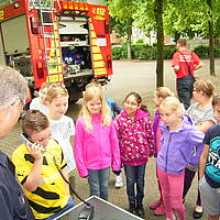 Kurz vor 8 Uhr fuhr die Freiwillige Feuerwehr Werne mit einem Tanklöschgruppen-Fahrzeug auf dem Schulhof der Wienbredeschule vor – die Brandschutzerziehung der dritten Klassen stand auf dem Programm. In zwei Gruppen wurden die Kinder zunächst in einem Theorieteil und danach in einem Praxisteil unterrichtet. Im ersten Block ging es um die Arten der Feuerwehren und darum, wie ein Feuer überhaupt entsteht. Es war schnell klar, dass im Brandfall Fenster und Türen geschlossen werden müssen, um das Feuer klein zu halten und die giftigen Rauchgase im Klassenraum und die Fluren als Fluchtwege frei zu halten – natürlich erst, nachdem die Kinder sicher den Klassenraum verlassen haben.