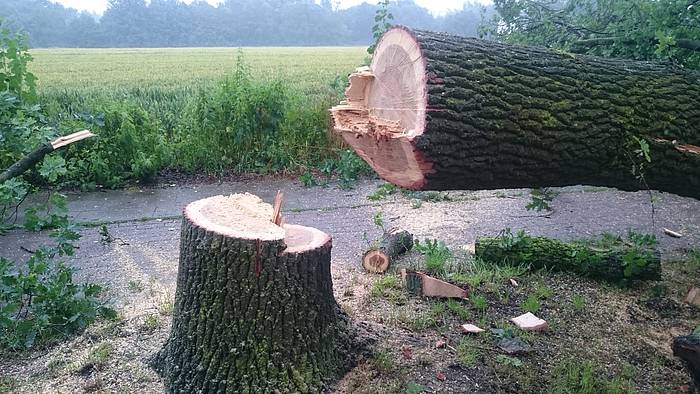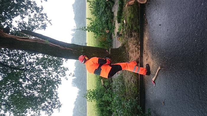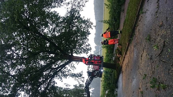 Mit einem Einsatzleitwagen, einem Rüstwagen und der Drehleiter rückte der Löschzug aus, um die Gefahr zu beseitigen. Durch die einseitige Entlastung der Eiche war letztlich die Standsicherheit insgesamt gefährdet. Das FeuerwehrGIS der Stadt verzeichnete den Baum bereits als „stark geschädigt“ und daher wurde in Rücksprache mit dem Ordnungsamt beschlossen, den Baum vollständig zu fällen, um Straße, Fuß- und Radweg wieder sicher passierbar zu machen.