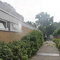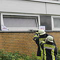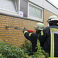 Die vorgefundene Lage hielt für die ehrenamtlichen Kräfte, wie im richtigen Leben im Übrigen auch, noch eine Überraschung parat: Es quillt Rauch aus dem Fenster des Heizungsraums! Ein Lehrer informierte den zuerst eintreffenden Einsatzleiter darüber, dass sich noch zwei seiner Schüler in der Turnhalle aufhalten würden. Ebenso war eine bewusstlose Person auf dem Flachdach der Turnhalle zu erkennen.