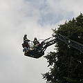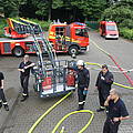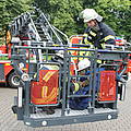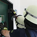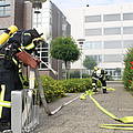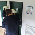 Im Anschluss dieser Übung wurden an verschiedenen Stellen des Gebäudes noch spezielle Workshops angeboten. Unter anderem wurde die Türöffnung geprobt. Die speziell ausgebildeten Kameraden in der Absturzsicherung übten den Umgang mit der Drehleiter und dem Absturzsicherungssatzes.
