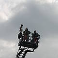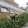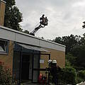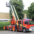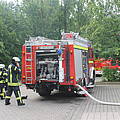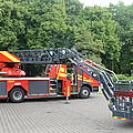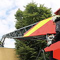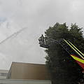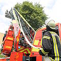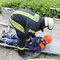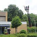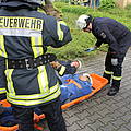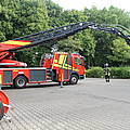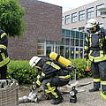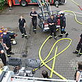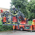 Parallel hierzu wird die Drehleiter in Stellung gebracht. Der vermeintlich bewusstlose Dachdecker muss vom Flachdach gerettet werden. Der Angriffstrupp vom Tanklöschfahrzeug bereitet die Patiententrage an der Drehleiter vor. Unter Berücksichtigung der Absturzsicherung wird die 80 Kg schwere Übungspuppe mit der Drehleiter vom Flachdach gerettet. Nachdem der Rettungskorb den Boden erreicht hat, übernimmt der anwesende Werner Rettungsdienst die Betreuung. Da auch mittlerweile die zwei vermissten Schüler im Gebäude gefunden und gerettet werden konnten, konzentriert sich der Einsatzleiter nun auf die Brandbekämpfung.