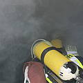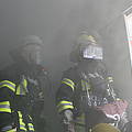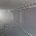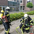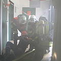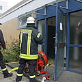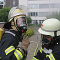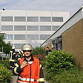 Der Einsatzleiter gab den Befehl zur Menschenrettung. Zwei Trupps drangen unter schwerem Atemschutz in die Turnhalle ein, um die vermissten Schüler zu suchen. Zusätzlich zu dem schweren Gerät, sind die Kameraden noch durch eine blickdichte Folie auf dem Visier der Atemschutzmaske gehandicapt. So gestaltet sich die Personensuche in die Turnhalle ungemein schwerer.