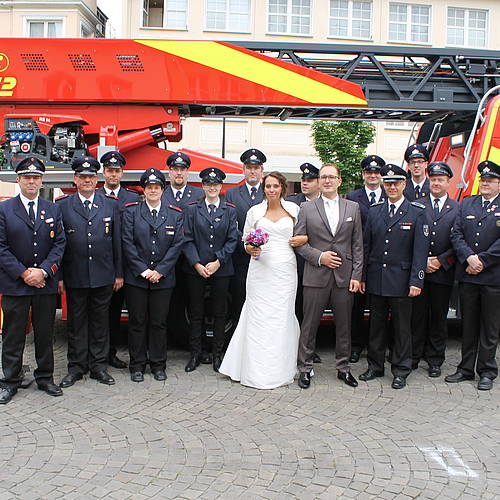 Zurück am Boden nahmen die beiden viele gute Wünsche entgegen - die eigentlich schon zu dritt sind. Denn im November erwartet das Paar seinen ersten Nachwuchs, der jetzt schon mal Drehleiter gefahren ist. Ob das eine Auswirkung auf ihre oder seine spätere Freizeitgestaltung haben wird, können wir jetzt noch nicht sagen, aber das dreifache, kräftige „Gut Schlauch“ der Kameradinnen und Kameraden hat sicher seine Wirkung getan und den Grundstein gelegt.