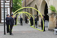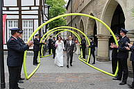 Heute war es wieder soweit: Eine Hochzeit stand an im Löschzug 1 der Freiwilligen Feuerwehr Werne. Um kurz vor 13 Uhr ging es in den Trausaal im Alten Rathaus am Marktplatz. Unser Kamerad Sascha Haverkamp und seine Braut Kerstin trauten sich was. Und – dem Vernehmen nach – sagten die beiden wohl auch gleich im ersten Anlauf „Ja“. Zumindest kam ein strahlendes Brautpaar aus dem Rathaus und wurden vom Löschzug mit dem traditionellen Spalier aus nagelneuen B-Schläuchen empfangen.