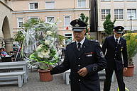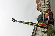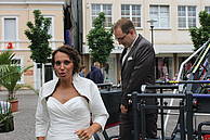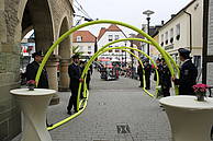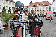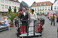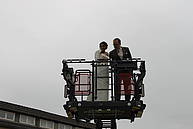 Nach der Übergabe des Brautstraußes ging es gleich Feuerwehr-technisch weiter. Am Ende des Spaliers wartete der Korb der Drehleiter, in dem Sascha seine Kerstin zwar nicht bis in den siebten Himmel, aber immerhin in eine Höhe brachte, in der man eine gute Aussicht auf den Marktplatz genießen konnte.