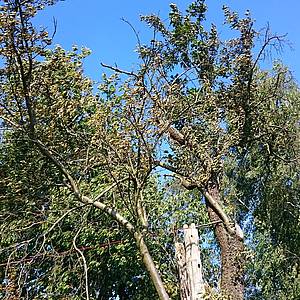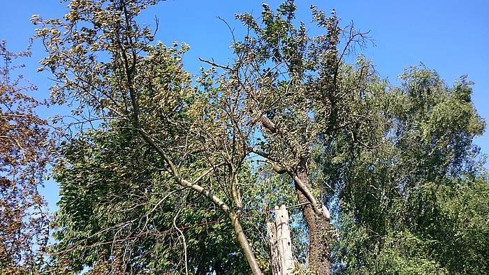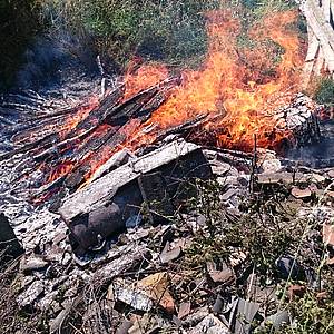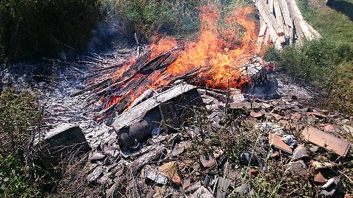 Tatsächlich handelte es sich um das private Verbrennen alten (Bau-)Holzes, das beim Eintreffen der Feuerwehr auch bereits deutlich kleiner war, als die Zeugen berichteten. Eine angesengte Hecke und die vertrockneten Blätter eines benachbarten Baumes sprachen jedoch eine deutliche Sprache. Auch eine Außentemperatur von deutlich über 30 ° C, aktuelle Hitzewarnungen und die mit Stufe 4 zweithöchsten Stufe des Waldbrandindex ließen den Betreiber unbeeindruckt.