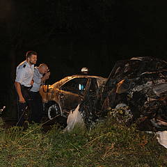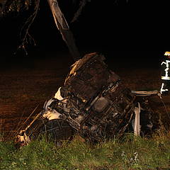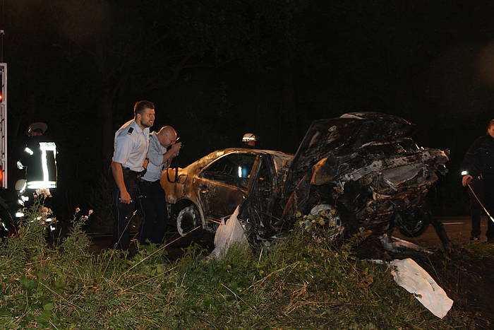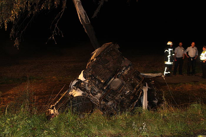 Die Feuerwehr unternahm einen umfassenden Löschangriff mit drei C-Rohren. Trotzdem war der junge Fahrer nicht mehr zu retten und verstarb am Unfallort.