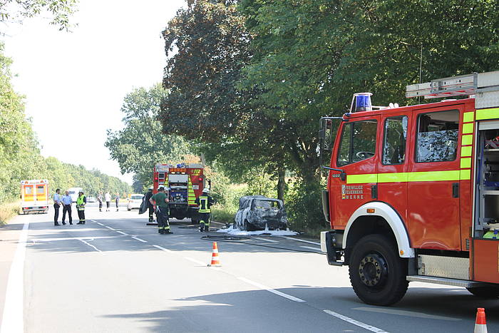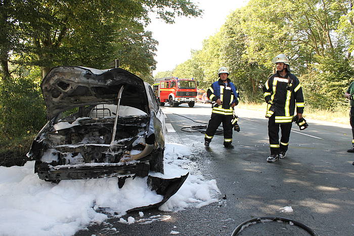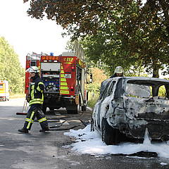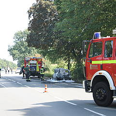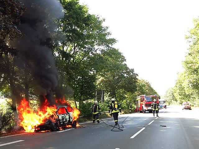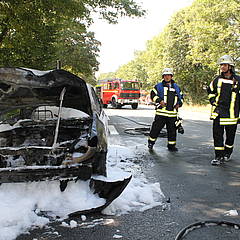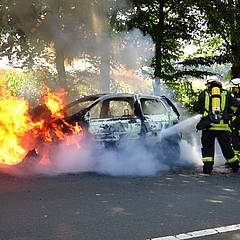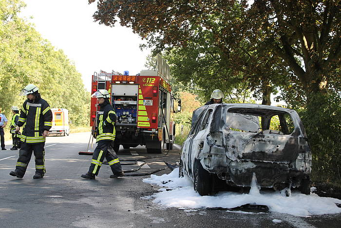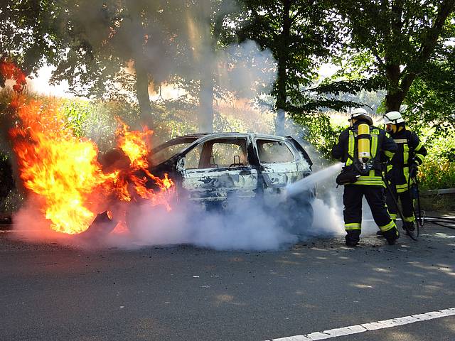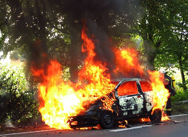Am heutigen Freitag um 13:54 Uhr wurden die Mitglieder der Freiwilligen Feuerwehr Werne zu einem PKW Brand auf die Nordlippestraße in Richtung Horst gerufen. Glücklicherweise konnte sich die Fahrerin unverletzt rechtzeitig in Sicherheit bringen, so dass niemand verletzt wurde. Beim Eintreffen der ersten Kräfte stand der PKW bereits im Vollbrand und die Flammen drohten auf naheliegende Bäume überzugreifen. Der erste Trupp löschte unter schwerem Atemschutz mit dem Schnellangriffsschlauch vom Löschfahrzeug den PKW.