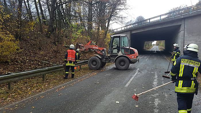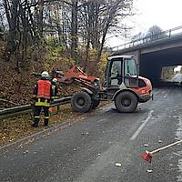 Um 15:35 Uhr ertönten erneut die Meldeempfänger der freiwilligen Kräfte. Diesmal war auf der Wesseler Straße kurz vor der Autobahnbrücke und demnach auf Holthausener Gebiet ein Baum auf die Fahrbahn gestürzt und blockierte diese. Die Löschgruppe Holthausen sicherte mit dem Löschfahrzeug die Gefahrenstelle gegen den Verkehr ab und es wurde auf kurzem Dienstweg ein Radlader zur Hilfe geholt.