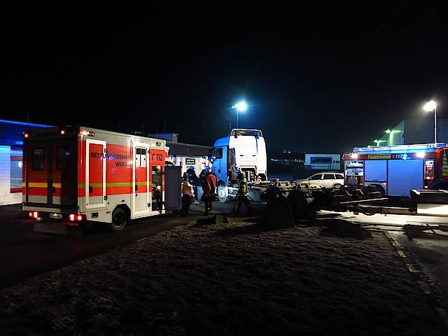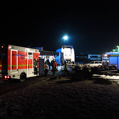 Der Fußgänger war unter dem LKW eingeklemmt und konnte somit nicht durch Ersthelfer versorgt werden. Daraufhin wurden um 06.26 Uhr der Löschzug Stadtmitte sowie ein Rettungswagen und der Notarzt alarmiert. Die männliche Person konnte relativ schnell durch vorsichtiges Zurücksetzen des Fahrzeugs und gleichzeitiges Anheben über die Luftfederung befreit werden. Der Notarzt konnte allerdings nur noch den Tod des Mannes feststellen. Im Einsatz waren 20 Einsatzkräfte mit vier Fahrzeugen.
