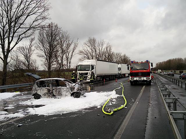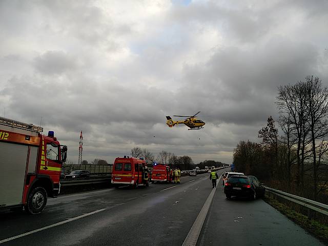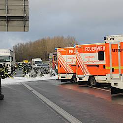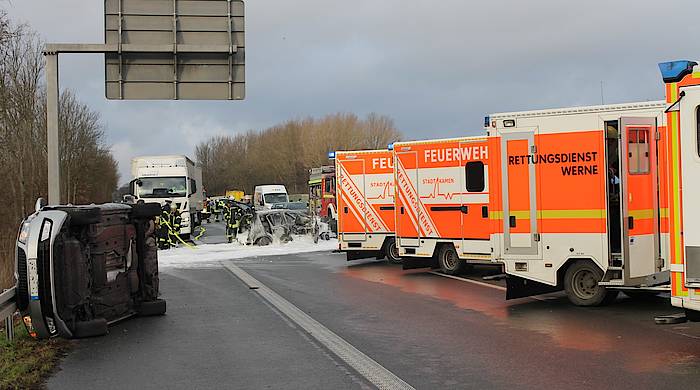 Am heutigen Freitagnachmittag wurde um 14:01 Uhr der Löschzug 1 der Freiwilligen Feuerwehr Werne auf die Bundesautobahn 1 in Fahrtrichtung Köln alarmiert. Gemeldet war ein PKW Brand. Bereits auf der Anfahrt wurde über Funk dem ersten ausgerückten Löschfahrzeug aus Werne durch die Kreisleitstelle Unna mitgeteilt, dass mehrere verunfallten PKW mit verletzten Personen beteiligt sind. Die Unfallstelle lag in etwa einen Kilometer vor der Ausfahrt Hamm/Bergkamen. Bereits auf der Anfahrt war eine Rauchsäule des in Vollbrand stehenden PKW sichtbar. Der zuerst eintreffende Einsatzleiter verschaffte sich einen Überblick über die Lage. Die acht verletzten Personen, darunter zwei schwangere Frauen, befanden sich nicht mehr in ihren Fahrzeugen und wurden bereits vom Rettungsdienst versorgt. Aufgrund der Anzahl von Verletzten wurden fünf Rettungswagen aus dem Kreisgebiet, Notärzte und der Organisatorische Leiter Rettungsdienst sowie ein Rettungshubschrauber auf die Autobahn beordert. Der brennende PKW wurde von einem Trupp unter schweren Atemschutz mit Schaum gelöscht. Die Wärmebildkamera half dem Trupp die versteckten Glutnester im Fahrzeug aufzuspüren und abzulöschen.