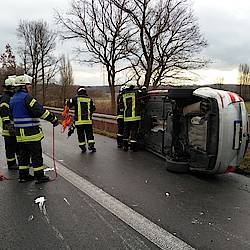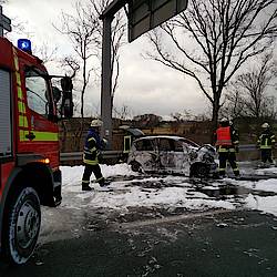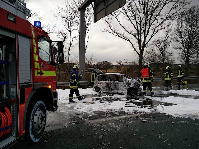Ein durch den Unfall auf der Seite liegenden PKW am Fahrbahnrand, stellten die Kameraden wieder auf seine Räder und klemmten aufgrund der potentiellen Brandgefahr die Fahrzeugbatterie ab. Mit Hilfe der Seilwinde des Rüstwagens wurde der völlig ausgebrannte PKW von der mittleren Fahrspur auf den Randstreifen gezogen, so dass das Abschleppunternehmen diesen verladen und abtransportieren konnte. Die Fahrbahn wurde von den Überresten des ausgebrannten PKW gereinigt und an die Polizei übergeben. Trotzdem ist die Fahrbahn aktuell so geschädigt, dass die Spur noch gesperrt ist.