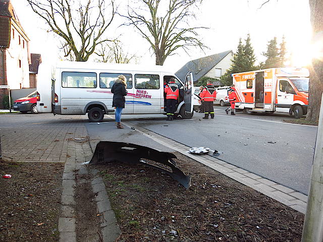 Um 15:21 Uhr am heutigen Freitagnachmittag (20.01.2017) wurde der Löschzug 1 der Freiwilligen Feuerwehr Werne zu einem unklaren Verkehrsunfall zwischen einem Kleinbus und einem PKW auf der Capeller Straße gerufen. Der zuerst eintreffende Rettungsdienst versorgte die zwei verletzten Personen.