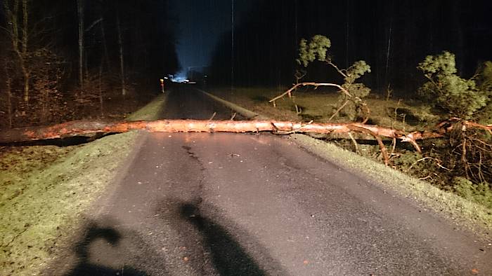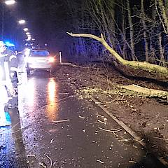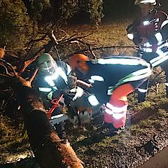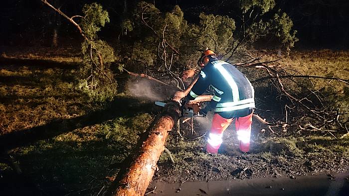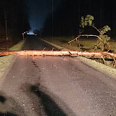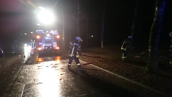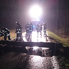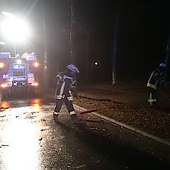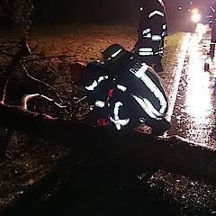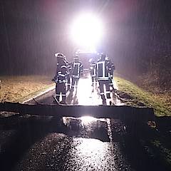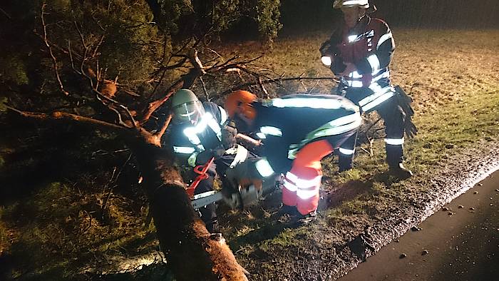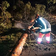Bis um 4:25 Uhr der nächste Alarm einging, hatten die ehrenamtlichen Kräfte der Feuerwehr erst einmal Nachtruhe. In den frühen Morgenstunden ging es auf die Steinbahn. Hier war eine Kiefer umgestürzt und die Straße Steinbahn blockiert. Per Kettensäge wurde das Hindernis entfernt, so dass der Löschzug nach ca. 30 Minuten schon wieder einrücken konnte.