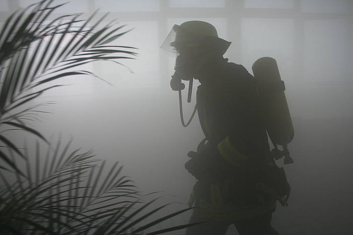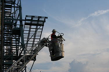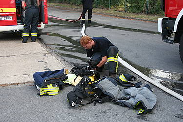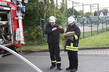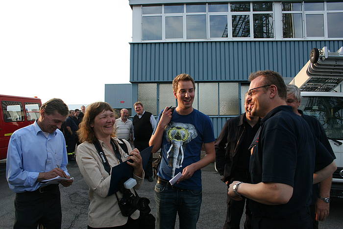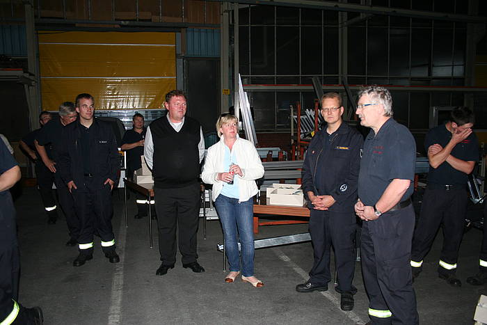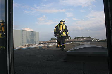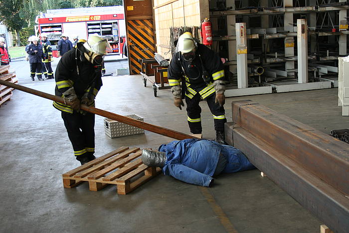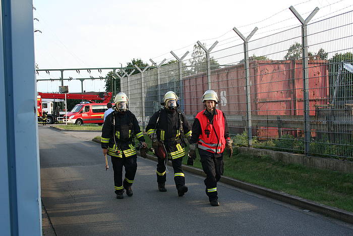 Am Mittwoch, dem 28.07.2010, fand der Dienstabend als Objektkunde auf dem Firmengelände der Böcker Maschinenwerke GmbH (www.boecker-group.com) in der Lippestraße statt. Für den Löschzug Stadtmitte gab es ein herausforderndes Szenario: In einer Filteranlage war ein Feuer ausgebrochen. Dadurch wurde ein größerer Bürotrackt vollständig verraucht. Im Bürobereich wurden zwei Mitarbeiter vermisst. Unterhalb der Filteranlage hatte abtropfendes Brandgut einen Container mit Alluminium-Spänen entzündet, wobei ein aufmerksamer Mitarbeiter schnell reagierte und den Container per Gabelstabler auf den Hof vor der Halle verbrachte. Das geschah allerdings in großer Eile, so dass es zur Berührung eines Bündels mit größeren Aluminium-Trägern kam, das daraufhin einen fliehenden Mitarbeiter einklemmte. Dieser war akkut gefährdet, weil zusätzlich ein Druckabfall in einer Stickstoffanlage bemerkt wurde, so dass mit sauerstoffverdrängendem Stickstoff in der Atemluft gerechnet werden musste.