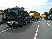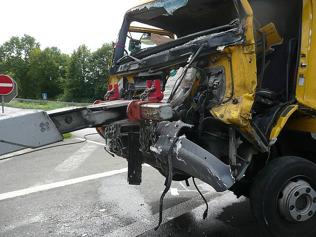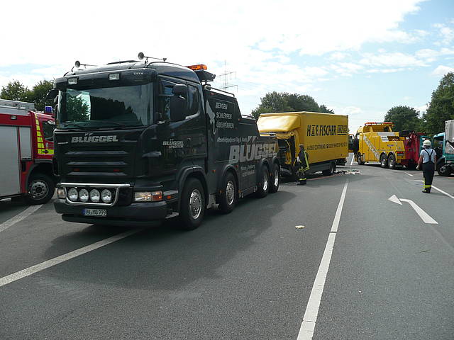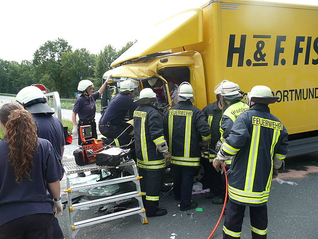 Um 12:44 Uhr am heutigen Mittag wurde die Feuerwehr Werne zu einem schweren Verkehrsunfall auf der Nordlippestraße in Höhe der Autobahnauffahrt in Fahrtrichtung Köln gerufen. Zwei LKW waren in den Unfall verwickelt, wobei ein Fahrer in seiner Kabine massiv eingeklemmt wurde. Der schwer verletzte Beifahrer konnte schnell aus dem Fahrzeug befreit werden. Nachdem der Rettungsdienst Werne, die Notärztin aus Werne und die Hubschrauberbesatzung von Christoph 8 den eingeklemmten Patienten medizinisch vorbereitet hatten, konnte die Arbeit der Feuerwehr beginnen. Mit hydraulischem Rettungsgerät wurde der Patient befreit und gemeinsam mit dem Rettungsdienst aus dem Fahrzeug befreit. Der zweite Fahrer stand unter Schock und wurde ebenfalls medizinisch betreut. Er kam ohne Verletzungen davon, weil die Pritsche, aber nicht das Fahrerhaus beim Unfall getroffen wurde.