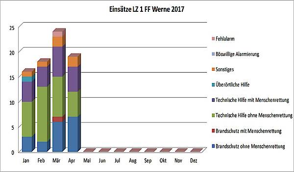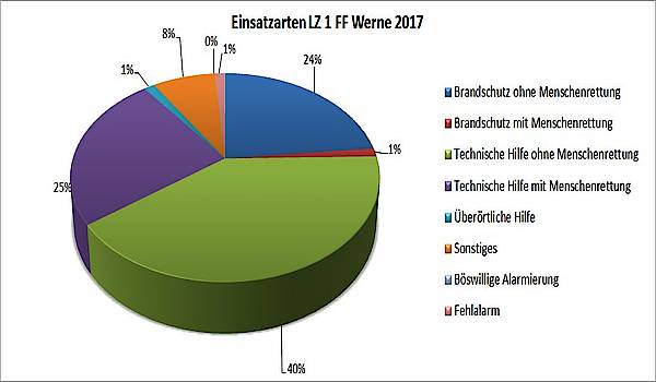 Zur Zeit versehen im Löschzug Stadtmitte 64 aktive Kameradinnen und Kameraden ihren Dienst, darunter sieben Feuerwehrfrauen. Diese werden unterstützt durch 10 Kameradinnen und Kameraden aus anderen Feuerwehren, die als Tageseinsatzkraft in Werne arbeiten. Insgesamt sind zu Beginn des Jahres 2017 74 Feuerwehrleute im Löschzug aktiv. Der Altersdurchschnitt liegt bei 37,1 Jahren. Die Ehrenabteilung besteht aus 26 Mitgliedern. Zuständig ist der LZ 1 für den Brandschutz im Stadtkern, den umliegenden Wohngebieten und den Gewerbegebieten Wahrbrink, Brede und Nordlippepark. Der Autobahnabschnitt BAB 1 (Fahrtrichtung Köln bis zur Anschlussstelle Bergkamen und Fahrtrichtung Bremen bis zur Anschlussstelle Ascheberg) gehört ebenfalls zum Einsatzgebiet des LZ 1. Zur Absicherung des Rettungsdienstes auf der Autobahn fährt der LZ 1 auch über diesen bereich hinaus. Zudem betreut der Löschzug die einspurige Bahnlinie Dortmund - Münster mit ausschließlich Personenverkehr. Insgesamt sind 49 Objekte durch Brandmeldeanlagen aufgeschaltet. Darunter zahlreiche Gewerbebetriebe (etwa das Amazon-Lager mit 110.000 Quadratmetern Lagerfläche, Galvanik-Betriebe, Sole-Bad, etc.), vier Seniorenheime, das St. Christophorus-Krankenhaus, Europas größte Gasverdichter-Station und die Amazon-Baustelle, usw.